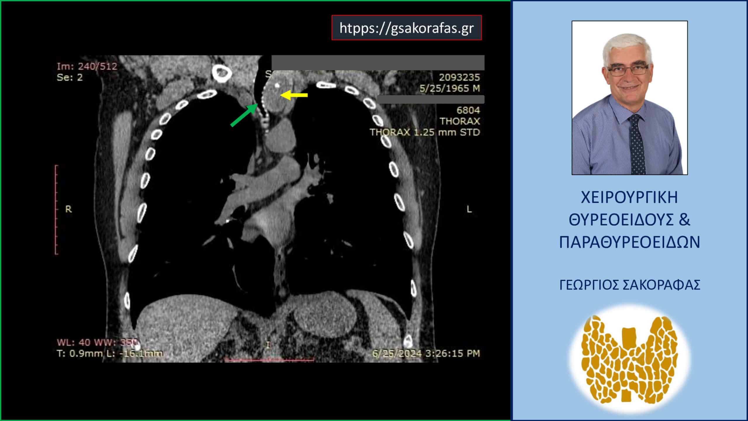 Απεικόνιση στην αξονική τομογραφία σε κατά μέτωπο διατομή (σε άλλο επίπεδο) όπου ο καταδυόμενος αριστερός λοβός του θυρεοειδούς (κίτρινο βέλος) φαίνεται να βρίσκεται μεταξύ της έκφυσης της αριστερής κοινής καρωτίδας και της ανωνύμου αρτηρίας από το αορτικό τόξο (ΑΟ).